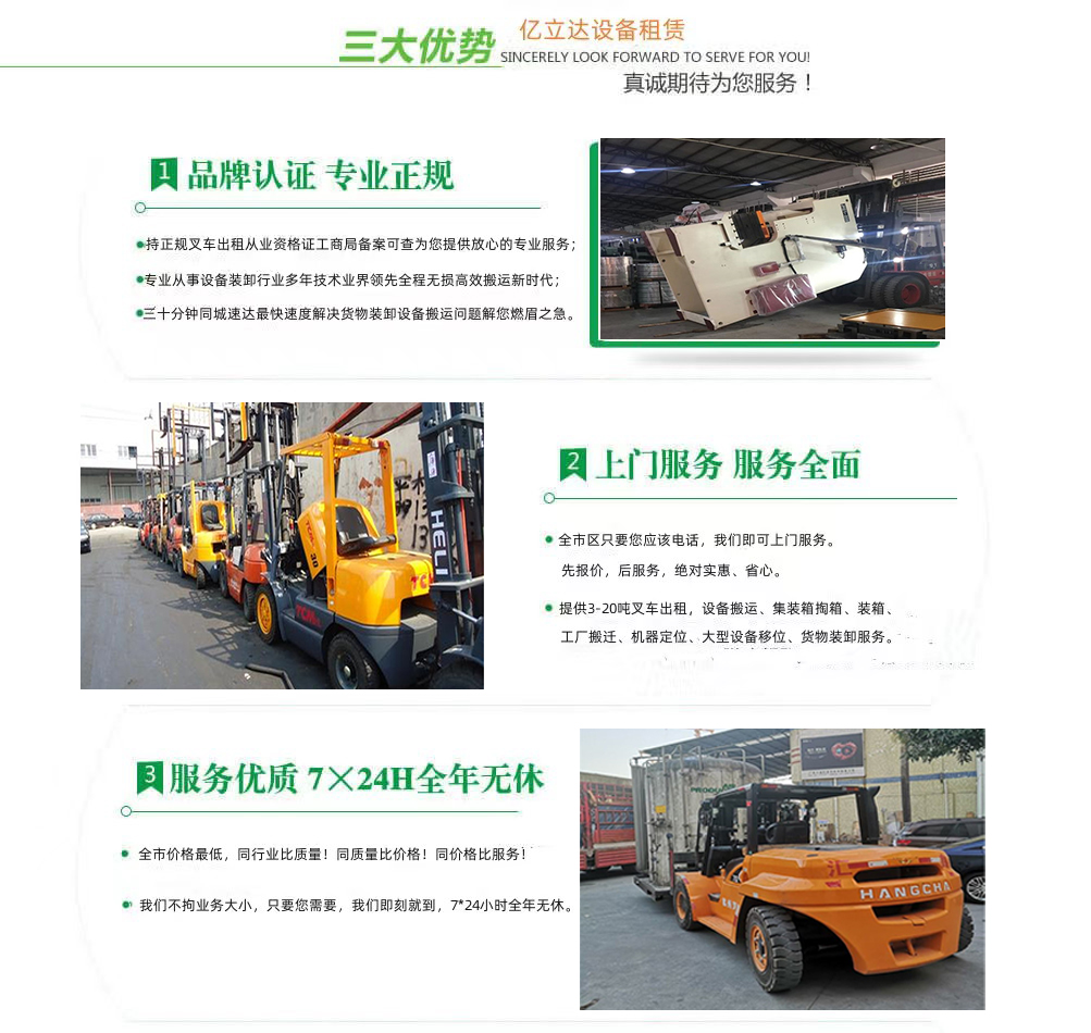 亿立达设备租赁有限公司是工商局准许的北京物资学院专业叉车出租公司,公司本着诚信、服务、效率、创新的经营理念,用精湛的技术,真诚的服务,为众多客户提供优质的服务,同时获得信赖与支持。专业提供北京物资学院3-20吨叉车出租、叉车租赁、设备搬运、集装箱掏箱装箱、机器移位定位、货物装卸、工厂搬迁、安全可靠,收费透明,价格便宜,随叫随到,24小时上门服务!本公司叉车吊车师傅对各种设备搬运装卸都有深刻探讨和研究。很多的疑难设备搬运,通过我公司的叉车师傅都能迎刃而解。对各种进口设备、国产机器、大型设备搬迁、高难度搬迁、各种精密仪器、医疗设备、科研设备等都能搬运; 提供全市 24 小时上门装卸搬运服务。同时提供厂房搬迁服务。 ...